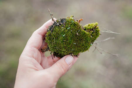 Green moss in the hand against the background of nature.