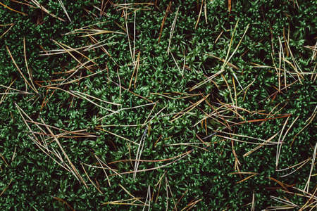 Green moss in autumn close-up. Moss macro. Nature background green forest moss. Lichen in the forest.