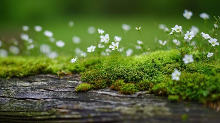A moss-covered log rests on the forest floor, surrounded by numerous small white flowers. The vibrant green backdrop adds to the tranquil beauty of this natural scene, showing nature's details.