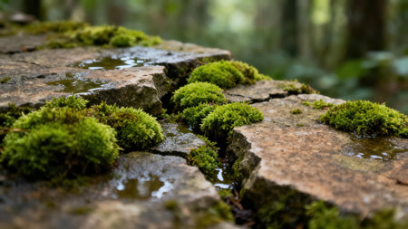 This picture is a close-up of a stone that has moss growing on it. This means that small homes for living things are hidden and calm.. Creative resource, AI Generated