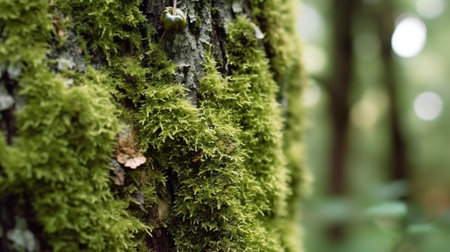 macro view of green moss on tree trunk, in shaded forest, created with generative ai
