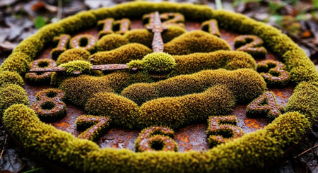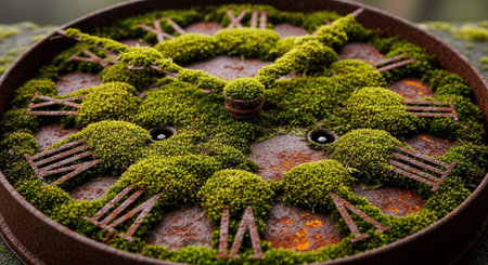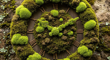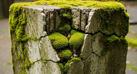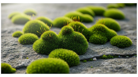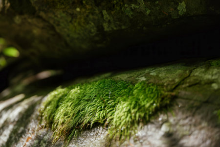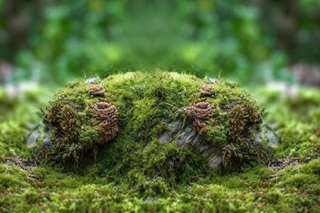 This picture is a close-up of a stone that has moss growing on it. This means that small homes for living things are hidden and calm.. Creative resource, AI Generated