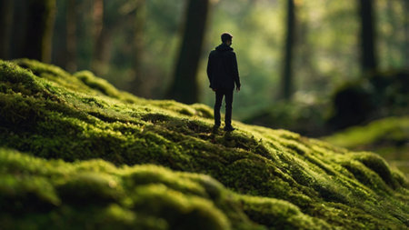 Explore the enchanting beauty of a serene forest scene showcasing vibrant moss covering tree roots, complemented by fresh green plants thriving in nature.