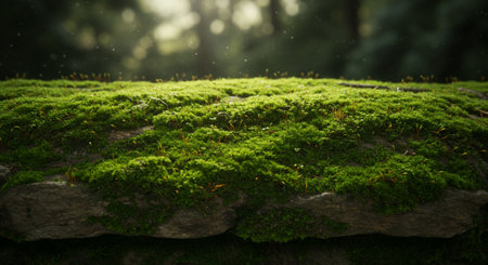 Captivating close-up view of vibrant green moss thriving on rough stone, illuminated by gentle light, creating a serene and peaceful natural landscape ambiance.