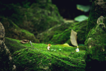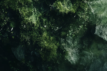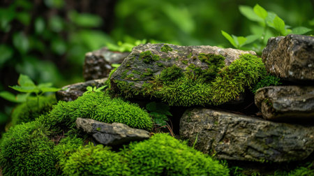 Lush green moss covers textured stones, creating serene and natural landscape. vibrant greenery contrasts beautifully with rugged rock surfaces, evoking sense of tranquility and connection to