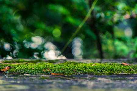 Green moss in the forest with bokeh background and copy space
