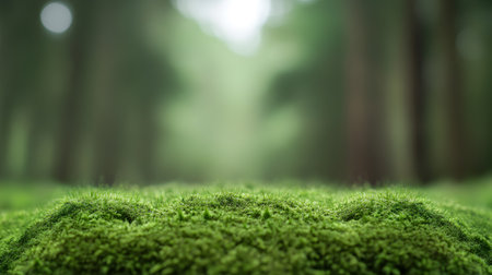 Lush green moss covering the ground, creating a tranquil botanical background with space for text, perfect for nature and wellness themes.