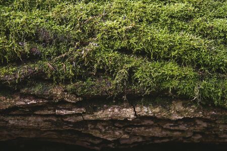 Green moss on a tree trunk in the forest. Nature background.