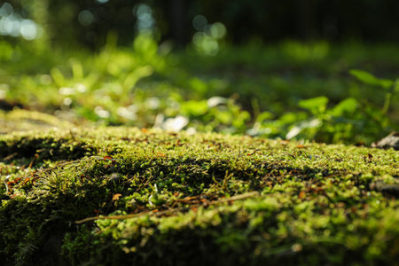 Green moss in the forest with bokeh background and copy space