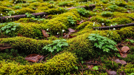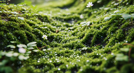 A detailed macro view of vibrant green moss covering uneven terrain, dotted with delicate white wildflowers and dew drops.