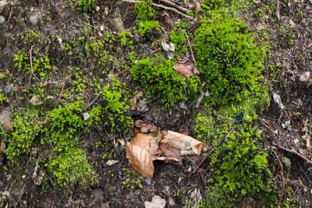 Detailed close up view on a forest ground texture with moss and branches found in a european forest