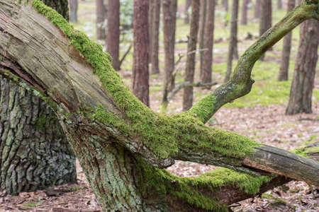 Tree fallen on the ground and covered with green moss and mushrooms blured background