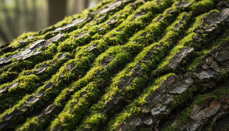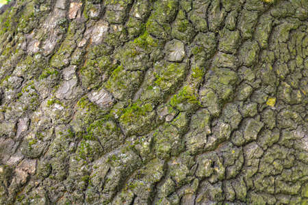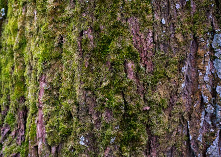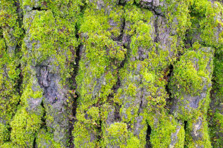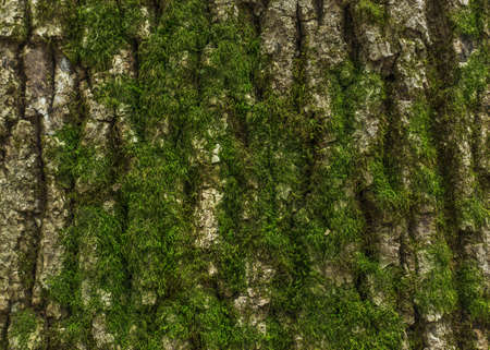 wooden texture old aged tree cracked bumpy bark covered with fresh green moss background