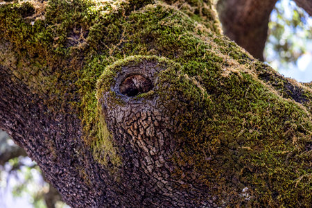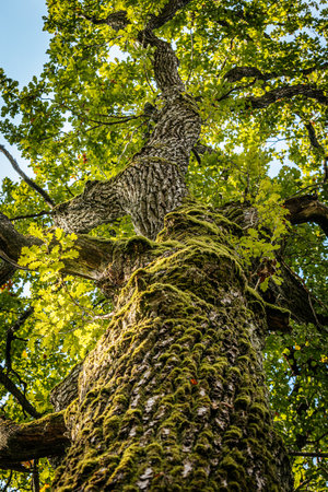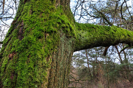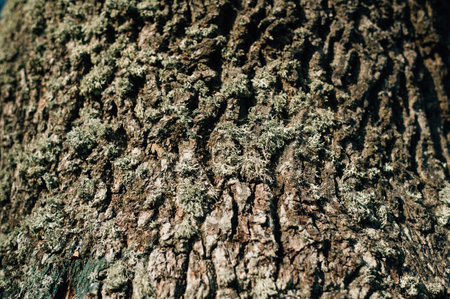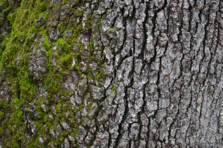 Oak bark covered with moss at base of tree close up, deciduous forest detail