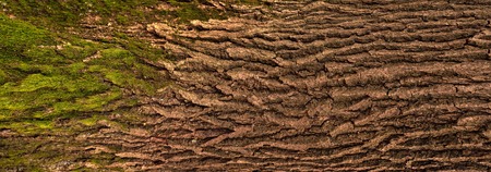 Embossed texture of the bark of oak with green moss. Panoramic photo of the oak texture.