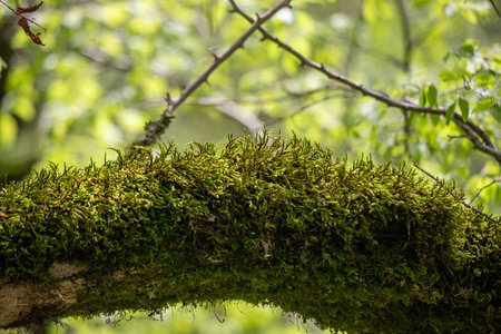 Close-up macro photo of green moss growing on the bark of a tree in the forest. Natural background showing the texture of moss and wood in soft daylight
