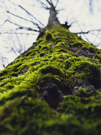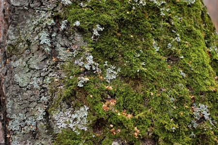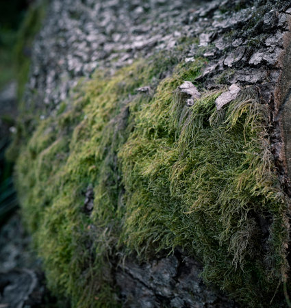 Close-up of green moss on tree bark in forest. Moss-covered tree trunk.