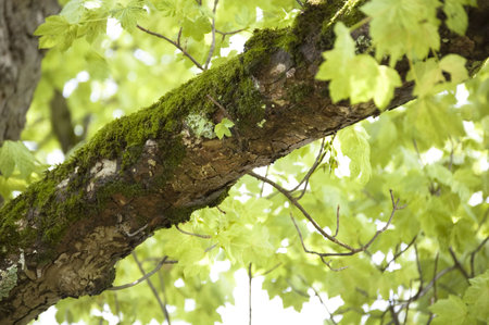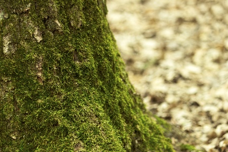 Green moss on the bark of tree in the forest. Close-up photo with bokeh.