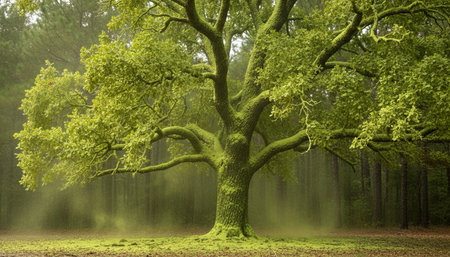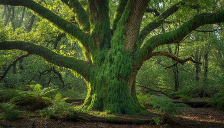An ancient, towering tree with sprawling branches stands resilient amid vibrant foliage, sunlight filtering through leaves, creating a serene, timeless atmosphere.
