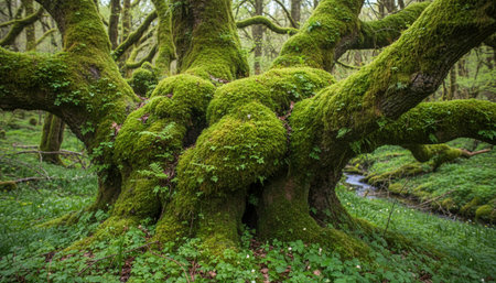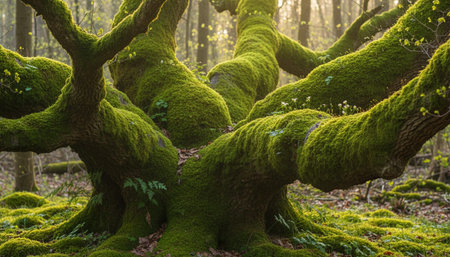 Close-up view of a moss-covered tree trunk in a dense forest. The scene evokes a sense of tranquility and mystery.