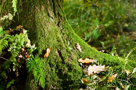 Moss hit by rays of the sun clinging to tree trunk and roots