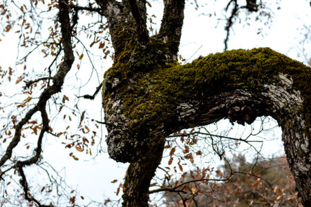 Fresh green autumn moss on old dry old trees in a bright carpathian forest in Ukraine covered with variegated fallen golden leaves
