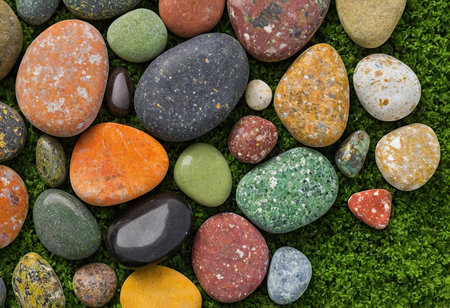 Explore a serene nature scene featuring vibrant green moss interspersed with smooth black stones, creating a peaceful and tranquil atmosphere perfect for relaxation and inspiration.
