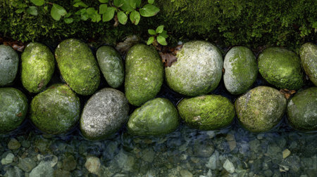 Smooth river stones arranged in a natural pattern along a shallow stream with clear water and moss