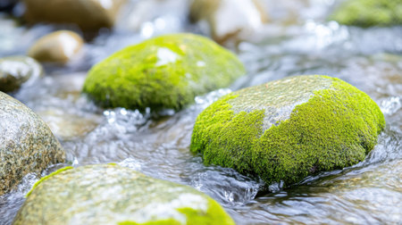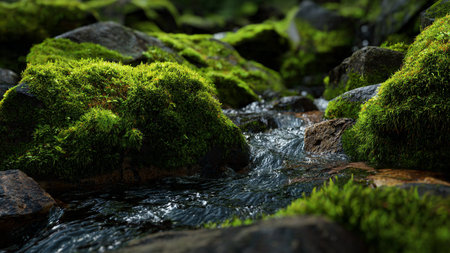 Vibrant moss-covered stones create a picturesque setting in a bubbling brook