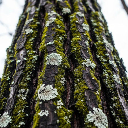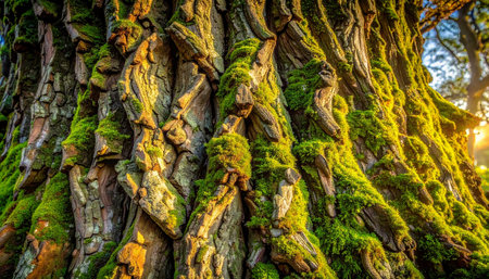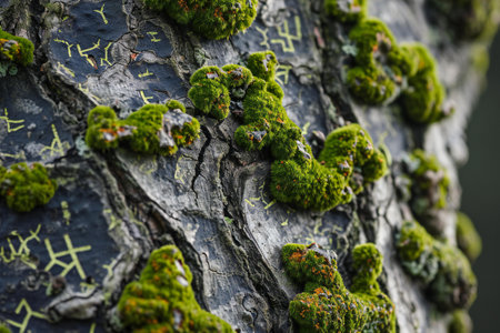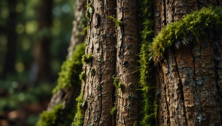This image captures the intricate detail of vibrant green moss growing on weathered tree bark, showcasing the beauty of nature's resilience in a tranquil setting.
