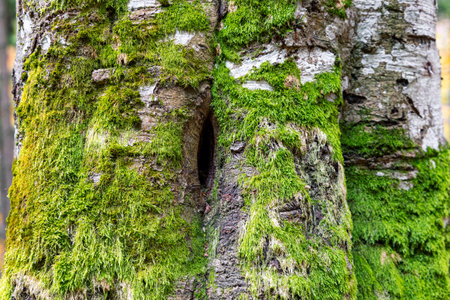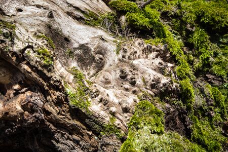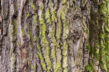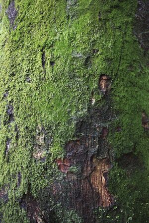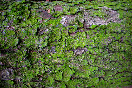wooden texture old aged tree cracked bumpy bark covered with fresh green moss background
