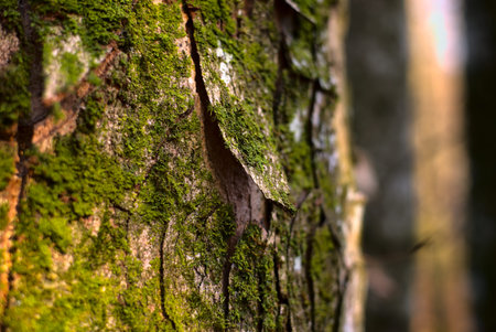 Green moss on the bark of tree in the forest. Close-up photo with bokeh.