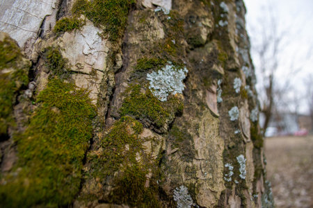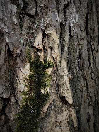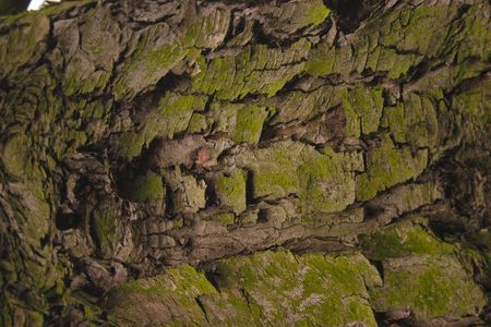 Oak bark covered with green lichen. Natural backgrounds and textures