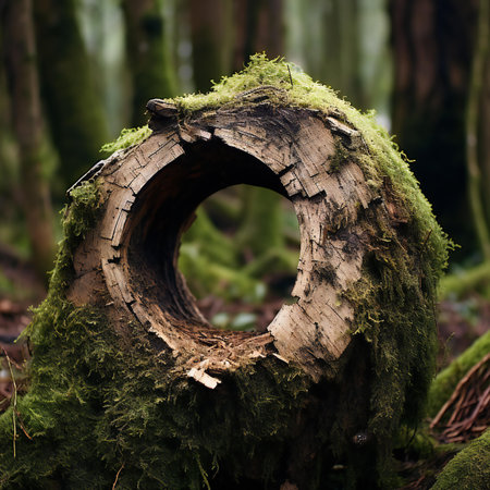 A captivating close-up of a tree stump showcasing intricate inner textures and vibrant green moss, set against a softly blurred nature backdrop.