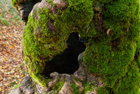 Fresh green autumn moss on old dry old trees in a bright carpathian forest in Ukraine covered with variegated fallen golden leaves