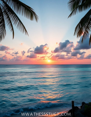 This stunning image captures a serene tropical sunset, featuring gentle waves lapping against the shore, palm trees framing the scene, and vibrant colors blending in the sky.