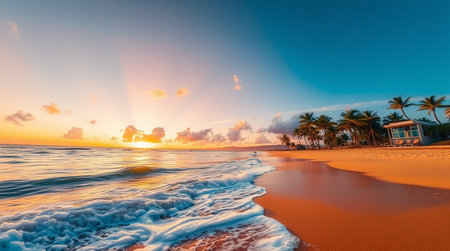 Vibrant beach scene, palm trees, golden sand, azure water, idyllic vacation imagery, website, travel brochure, advertisement.