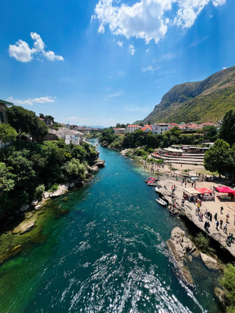 A tranquil river flows between lush greenery and rugged mountains under a bright blue sky. Mostar, Bosnia and Herzegovina.