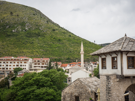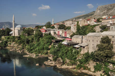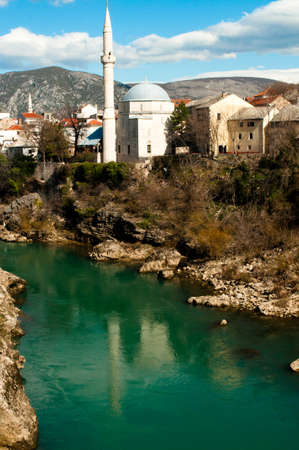 Mostar, Bosnia Herzegovina - May 1, 2014: Nerteva River and Old City of Mostar, with Ottoman Mosque