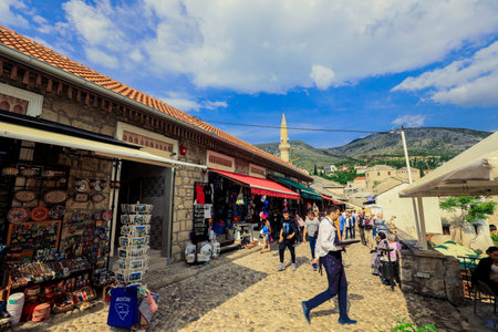 Mostar, Bosnia and Herzegovina - May 12, 2022: Old Town in city center of Mostar with the Colorful Traditional Souvenirs with Walking Tourists