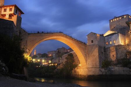 Evening view of Stari most (Old Bridge) and old stone buildings in Mostar. Bosnia and Herzegovina