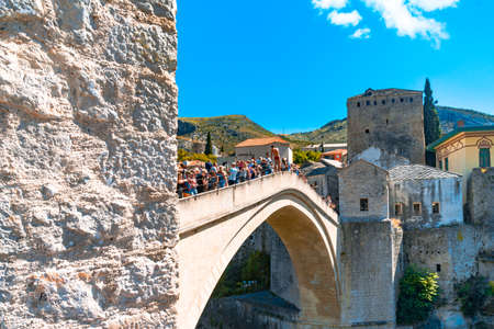 MOSTAR, BOSNIA AND HERZEGOVINA - AUGUST 05, 2015: Tourist and locals walking near Old bridge in Mostar. Included to the UNESCO heritage