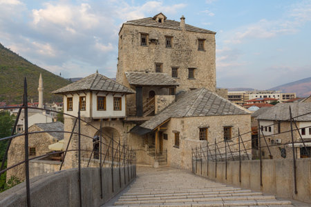View of the tower of the Old Bridge in the Old Town of Mostar at dawn. Bosnia and Herzegovina