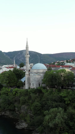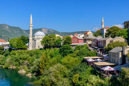 Mostar, Bosnia and Herzegovina – August 17, 2022: View of historic buildings, mosque minarets and the Neretva river in the old town of Mostar.