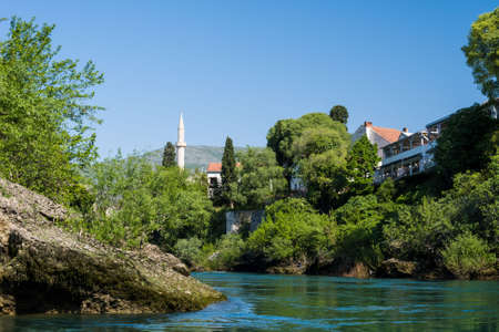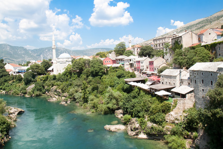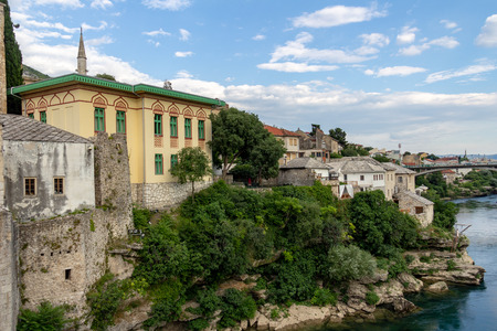 Views of Mostar with colored facades and roofs on the banks of the Neretva River in Bosnia, Europe.