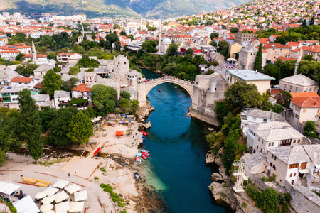 Aerial view of the old bridge of Mostar, famous tourist destination in Bosnia and Herzegovina