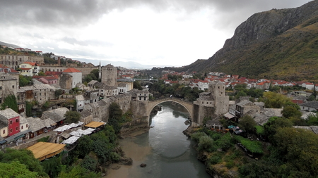 Drone view of the historical old Mostar Bridge. Bosnia and Herzegovina, Europe.