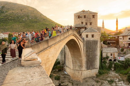 MOSTAR, BOSNIA AND HERZEGOVINA - AUGUST 12, 2015: Tourist and locals walking over Old bridge in Mostar.The bridge is included to the UNESCO heritage