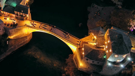 Aerial view on the Old Bridge in Mostar at night, Bosnia and Herzegovina