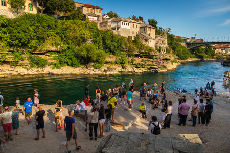 Mostar, Bosnia and Herzegovina – August 16, 2022: Crowd of people gathered along the Neretva River near a cliff diving platform with historic buildings and bridge visible in the background in Mostar.